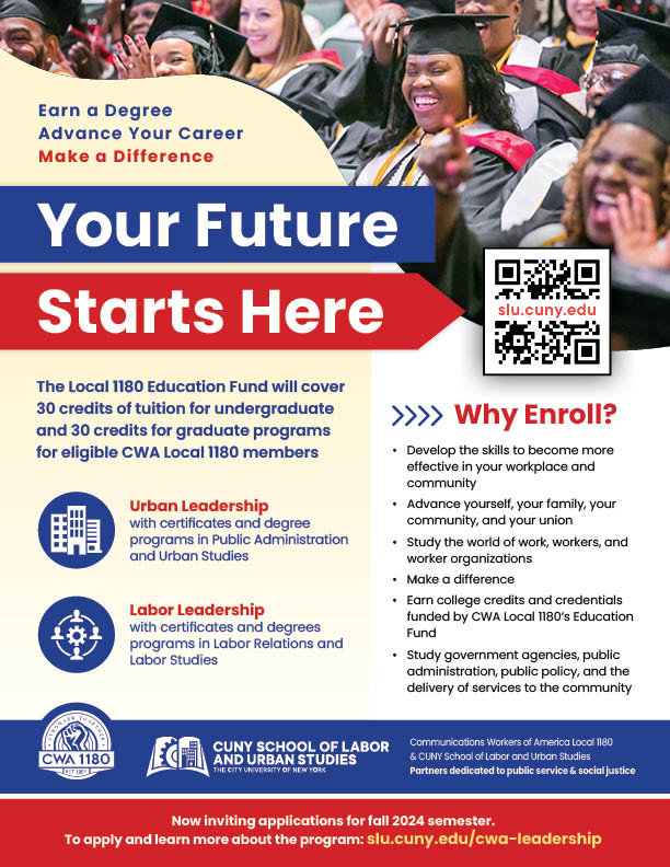 CWA Local 1180 Education Fund sponsors fund participants up to 30 credits for undergraduate study and up to 30 credits for graduate study.